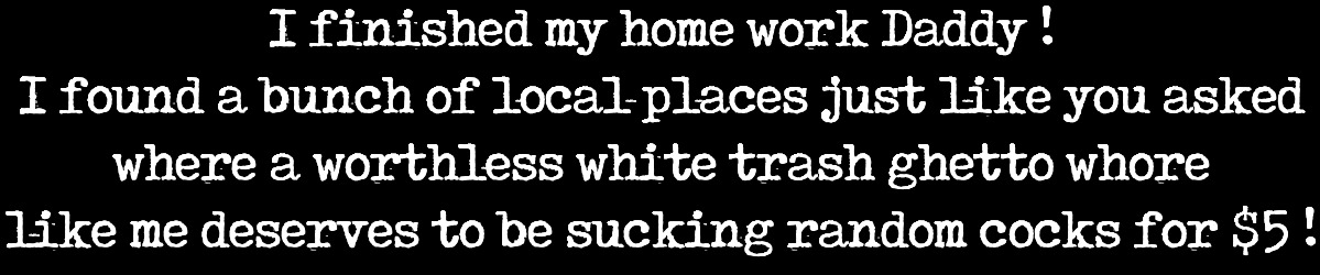 ♠️ I Will Be A Pimped Sissy Ghetto Whore For Black Gangs ♠️ I will Be Whored Out In The Local Ghetto Back Alleys Because I Am Not Good Enough To Work Indoors Until I Prove My Worth By Servicing At Least 500 Customers And Show A Decent Profit Potential To My Black Pimps ♠️ I Was Born To Suck Cocks In Filthy Back Alleys Actually And Is A Part Of My White Privilege Working As A Ghetto Whore For Black Pimps ♠️ I Will Be Forced To Work In A Piss Soaked Ghetto Back Alley Under A Street Light Next To A Filthy Dumpster With A Sign That Says "PUBLIC URINAL" On The Wall Behind Me ♠️ This Will Become My New Workplace And The Filthy Piss And Cum Soaked Old Mattress Laying On The Ground Next To The Dumpster Will Be Where I Entertain My Customers ♠️ My Black Pimps Will Advertise My Location And Post Videos Of Me Being Pissed On Online So Any Guy Wanting A $5 Blowjob Can Pay Me A Visit ! ♠️ I will Suck Complete Strangers Next To The Filthy Dumpster For 5 Dollars ♠️ Local Blacks Will Take Turns Fucking My Ass While Pushing My Head Into A Pile Of Garbage Bags ♠️ They Will Piss On Me When They Are Done Using My MOuth And Ass As Their Cum Receptacles ♠️ Becoming A Cheap Ghetto Whore for BNWO™ inc. Is What I Look Forward To As My Role A Sissy $ex $lave ♠️ My White Trash $issy Whore Ass Will be The Property of Black Gangs ♠️ I Will Be A $ex $lave For Blacks ♠️ Addicted and Enslaved By My Black Cock Obsession Unable To Resist Any Temptations ♠️ My $lut Holes Will Be Gang Fucked, Used and $old on The Street for Profit ♠️ I WIll Eat Their Cum, Drink Their Piss And Lick Their Black Assholes Clean On Command and I Will Thank Them When I Am Done ! ♠️ Thankyou Sir ! ♠️